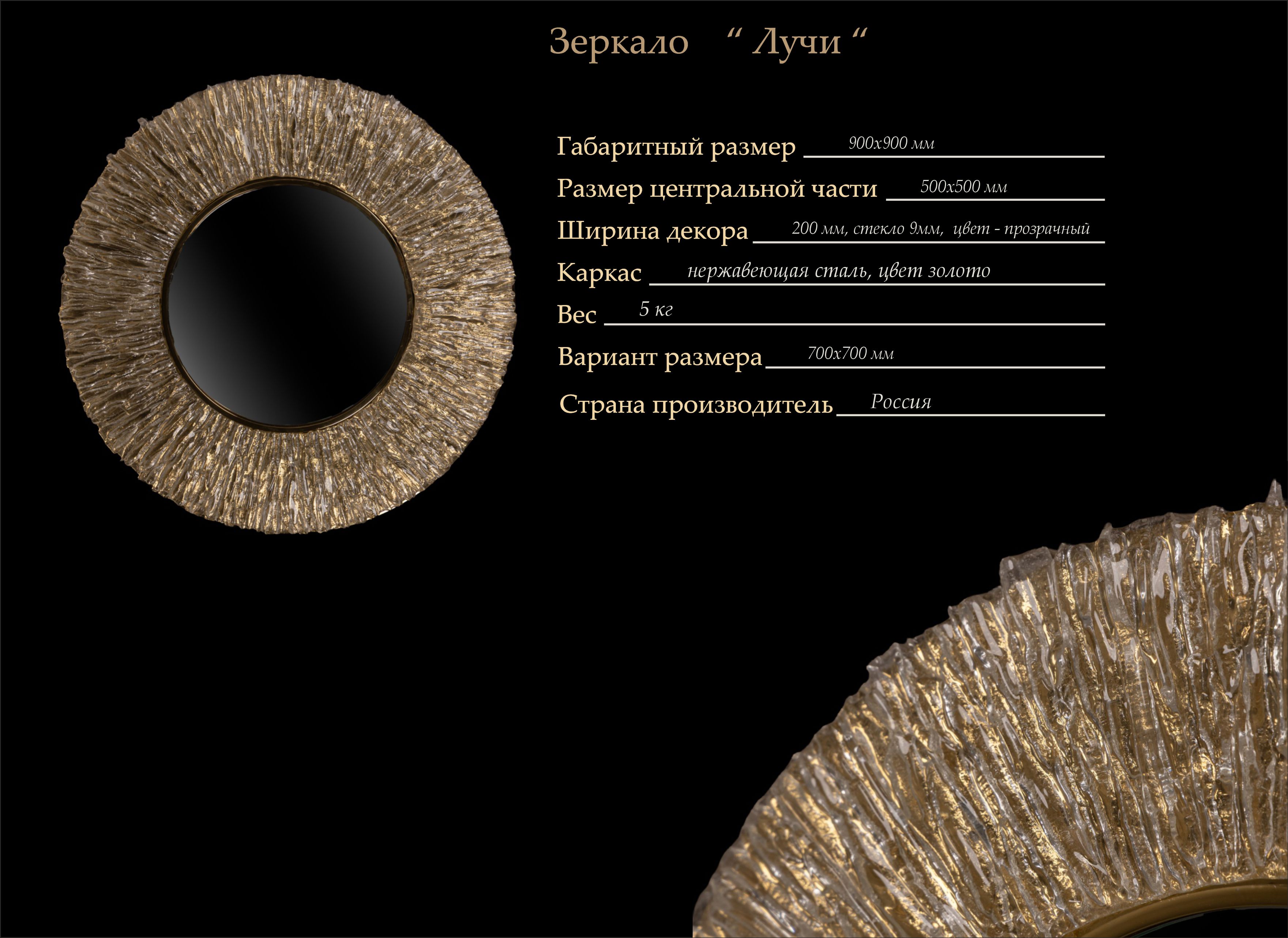 Его уникальная рама, выполненная из стекла в технике моллирования, напоминает  лучи солнца. Благодаря этому, зеркало станет не просто отражающим элементом, а настоящим арт-объектом, притягивающим взгляды.